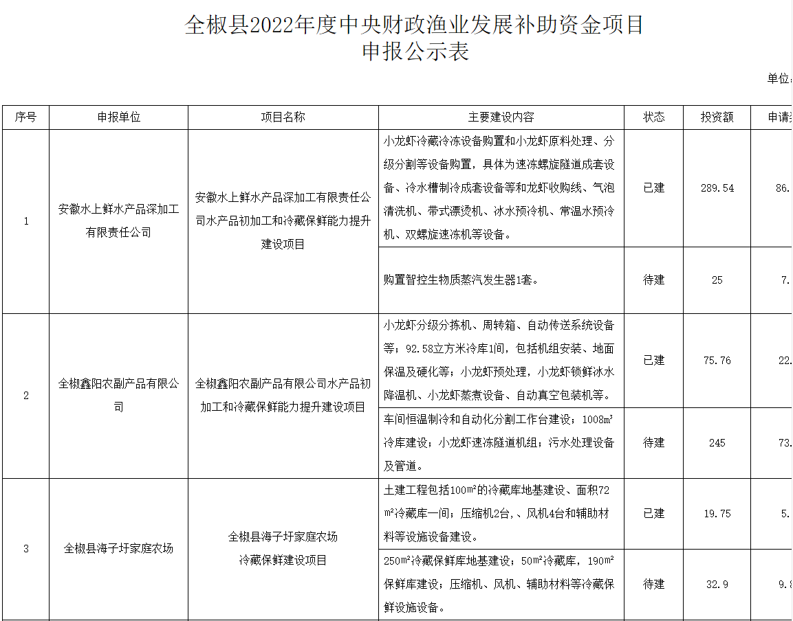 經(jīng)自主申報,村鎮(zhèn)推薦,截止2022年7月4日,共有4個漁業(yè)經(jīng)營主體進(jìn)行了全椒縣2022年度中央財政漁業(yè)發(fā)展補助資金項目申報,項目建設(shè)主要內(nèi)容為水產(chǎn)品初加工和冷藏保鮮能力提升等。經(jīng)農(nóng)業(yè)農(nóng)村局組織的評審組初審和局黨組研究決定予以立項扶持?,F(xiàn)對上述4個申報全椒縣2022年度中央財政漁業(yè)發(fā)展補助資金項目的經(jīng)營主體進(jìn)行公示,具體內(nèi)容見附表。公示時間2022年8月30日至2022年9月5日。